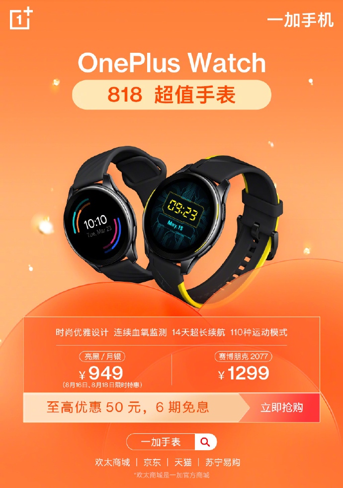 IOT产品上,一加也带来多重优惠。一加手表运动版原价999元,8月16日-18日,限时优惠50元,享受6期免息;一加手表赛博朋克2077限定版1299元,活动期间享受6期免息;一加首款主动降噪旗舰耳机onePlus Buds Pro享3期免息。