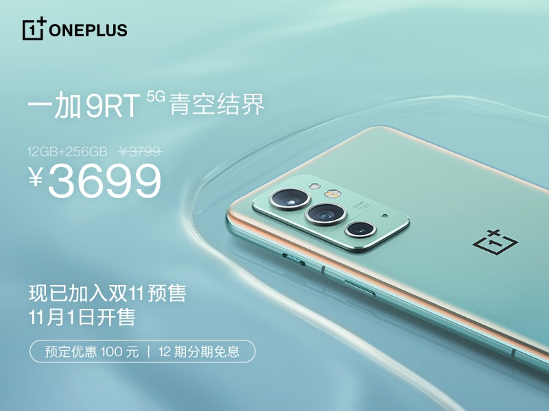 10 月 26 日,一加官宣一加 9RT特别版青空结界配色开启预售,12 GB RAM + 256 GB ROM 版本售价3799元,预定可享 100 元优惠。用户可在OPPO商城、京东商城、一加天猫旗舰店、苏宁易购、九机、一加授权零售店等线上线下全渠道预约购买。