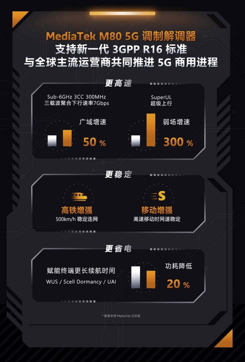 联发科M80下行速率广域增速提升50%,多载波聚合实现7Gbps的速率;在R16超级上行特性的支持下,其弱信号环境下增速最高可实现300%的提升。在连接稳定性上,针对高铁等快速移动的场景,联发科M80能够在500km/h的高速移动中维持信号的速度和稳定,保证了稳定可靠的网络体验;而在速度和稳定性提升的基础上,联发科M80有着意想不到的低功耗表现,在R16标准下可使功耗降低20%,帮助终端实现更长的使用时间。