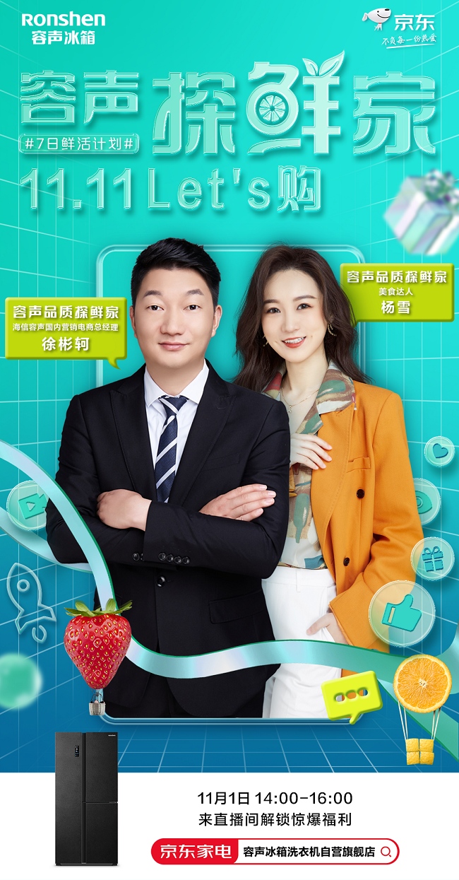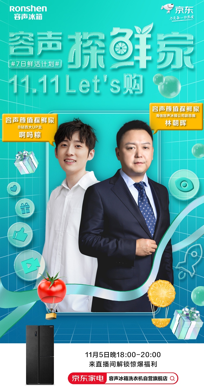 为贯彻品牌年轻化,容声本次在一年一度的双十一进行了一波扩张线上市场的强势动作。不仅在京东强势发布容声WILL时尚版冰箱,卷起种草风潮。更是打造了“容声探鲜家 11.11 Let’s购”主题活动,并借势微博、抖音等主流社交媒体,进一步引爆声量巨浪,多平台联动打造出容声专属双十一线上矩阵。 容声总裁徐彬轲及副总裁林朝晖先生更是先后亲临京东直播间,搭档B站百大up主啊吗粽,为容声冰箱助力站台宣传。“总裁价到”爆梗出圈,高层的亲民形象也令粉丝对品牌的好感度直线上升。