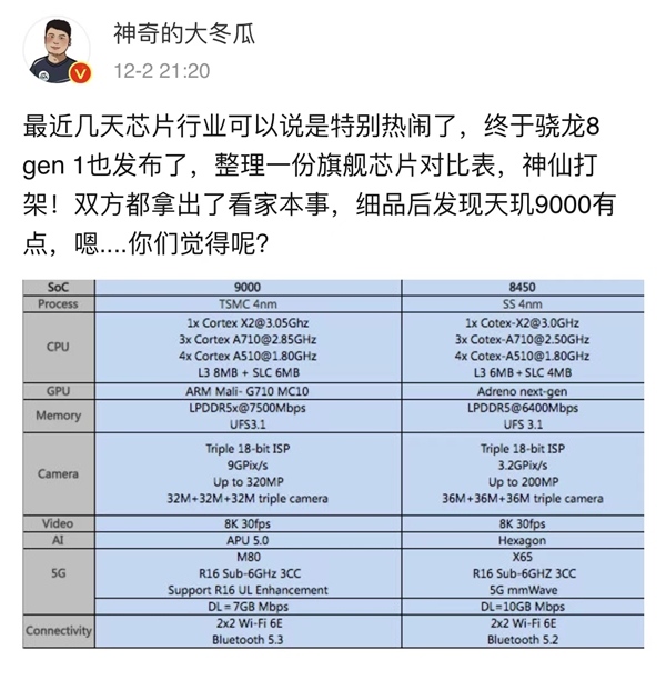 高通骁龙和联发科天玑的旗舰之争,随着一组参数对比图的发布逐渐清晰。骁龙8 gen 1对阵天玑9000,从下图可以看出两家基本是平分秋色,但是在一些细节之处,显然是联发科的天玑9000用料更足。