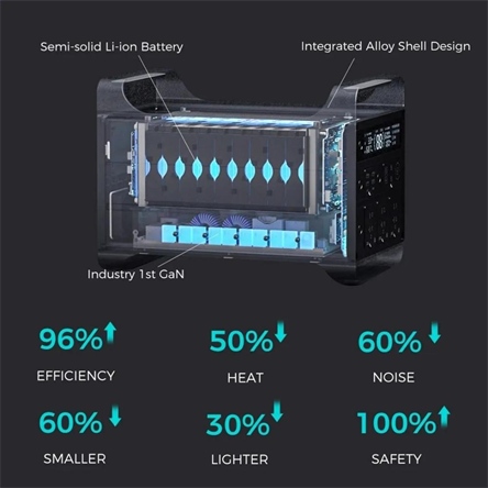 相比同类产品,移族墨子M2000的体积大约小60%,重量轻30%,这是因为其采用了更高能量密度的半固态电池,大约比普通锂电池高40%;采用更高能量密度的氮化镓逆变器,逆变器体积缩小30%;同时采用了六系合金一体化机身设计,提升了零部件复用度,外壳,框架,散热器3合一,所以整机的体积只有同规格友商一半左右,重量也减轻了30%左右,非常方便户外高频次出行携带。