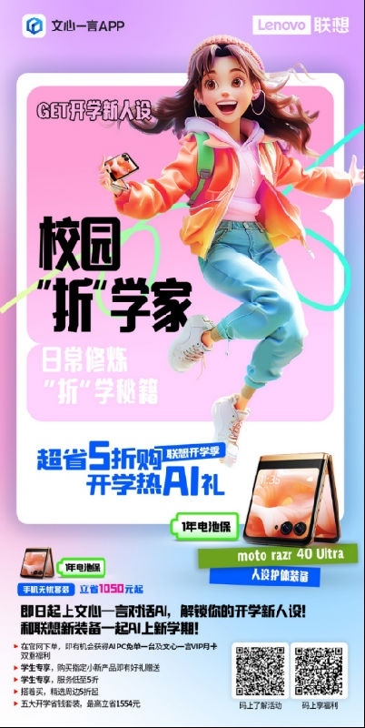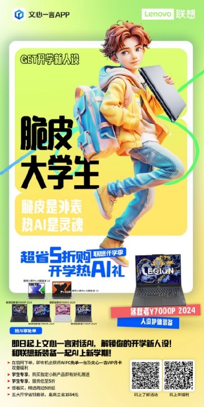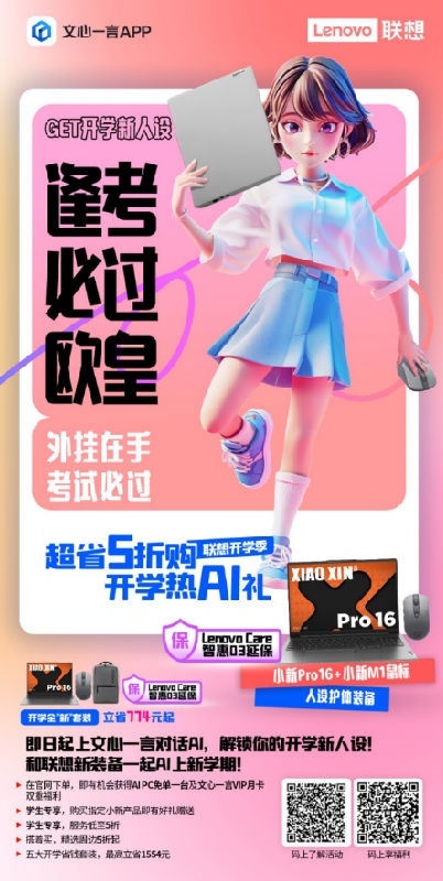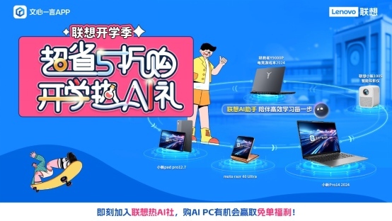 此次联想与百度文心一言携手开启的“超省5折购,开学热AI礼”活动,在文心一言App通过校园折学家、脆皮大学生、逢考必过欧皇、搭配尖子生等十大词汇,为广大学生挑选最合适的开学套装,带来如套装至高立省1554元、服务低至5折、组合购买周边5折起等优惠,同时还可扫码加入联想热AI社,下单即可抽取AI PC免单福利。