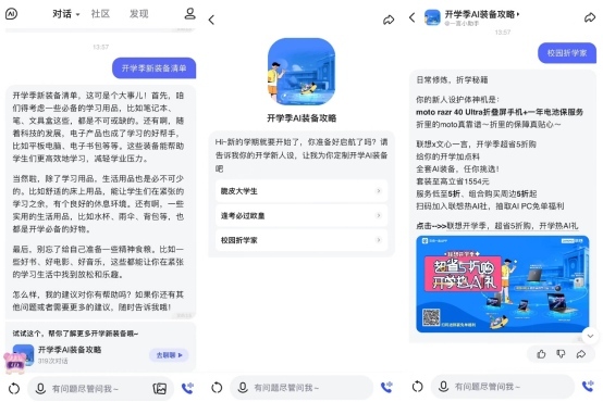 联想与文心一言联动推出的这三类标签就是大学生最真实的精神状态,可以在APP上根据提示词选择自己的人设,便能获得AI推荐的“专属”优惠套装。进入相关活动的方法简单粗暴,只需要下载并打开文心一言APP,选择对话选项,输入开学季新装备清单,即可获取“开学季AI装备攻略”主题页面,进入页面后便可根据自己的人设选择专属的开学季AI装备推荐啦。
