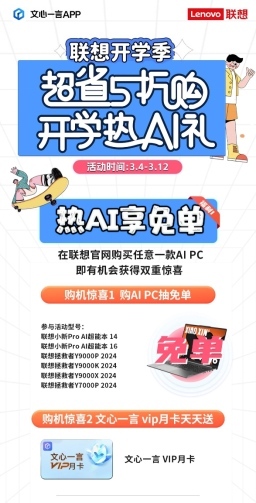 当然不止有5折起的组合购套装,还有惊喜免单好礼等你解锁。3月4日到3月12日期间,凡是在联想官网购买过任意一款AI PC产品,即可参与抽奖抢免单的超值活动,还有文心一言VIP月卡天天送,持续为即将开学的朋友们保驾护航。