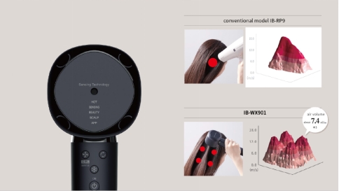 在日本,美发沙龙的专业发型师常会使用一种吹头发的技巧:两个吹风机同时吹风,看似是通过双倍的风力来加速干发,但其实背后有一个更有趣的原理,即通过双股气流让头发产生三维立体的波动效果,从而无需依赖高温,实现快速干发。业界将其称之为“悬垂气流技术”(Drape Flow)。基于这一技术,夏普推出了双风道吹风机IB-WX1系列产品,该系列在市场上获得了极佳的反响。但由于双风道的设计在侧向吹风时会影响波动效果,用户需要特别注意吹风机的角度,夏普设计师以及工程师秉承着精益求精的精神,重新设计了吹风机的内部结构,并在电机组件上做了重大改良,最终设计出可以四点出风的IB-WX901系列。四点出风的气流能让头发从任何方向快速干透,无论是从头顶、后方、垂直或是水平方向,都能形成悬垂气流效果,从而迅速吹干整头头发。它与我们传统的吹风机相比,干发时间减少了35%。