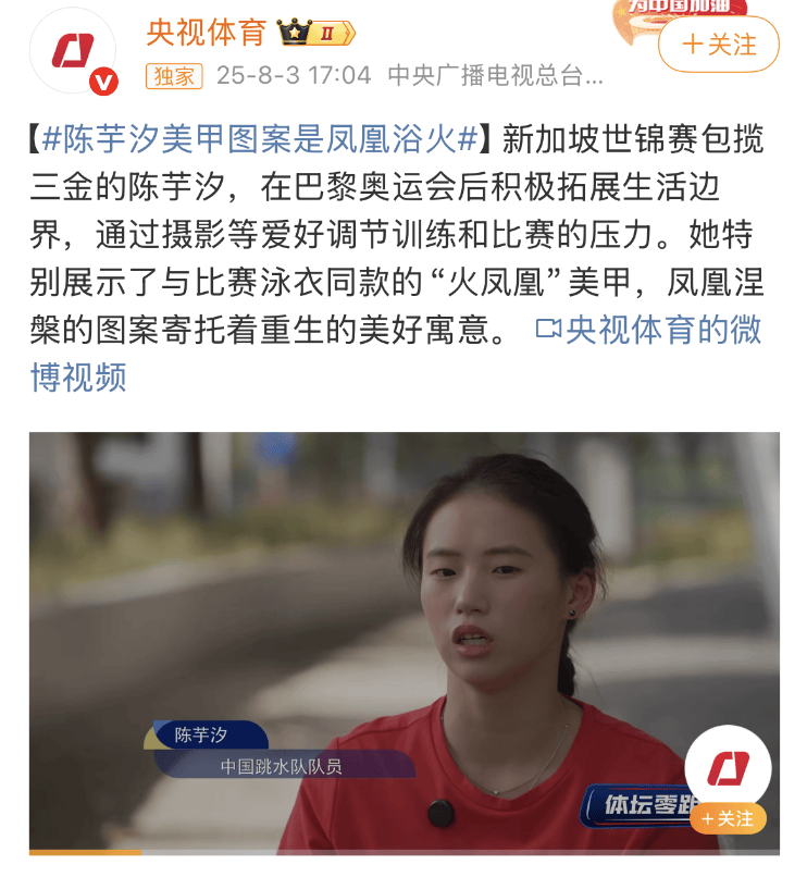 赛后,央视体育对陈芋汐进行采访,报道中,这位跳水冠军还展现出有别于赛场风采的另外一面:一个热情的摄影爱好者,她说:摄影让她发现更多新鲜的事物,可以帮她调整训练和赛场上的压力。