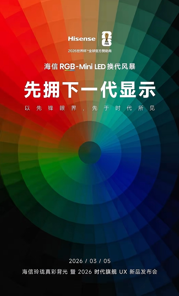 马年开年,科技圈迎来重磅定档——海信RGB-Mini LED超旗舰电视UX2026款将于3月5日正式发布。海报上“海信玲珑真彩背光”、“时代旗舰”的信息抓足大众眼球。